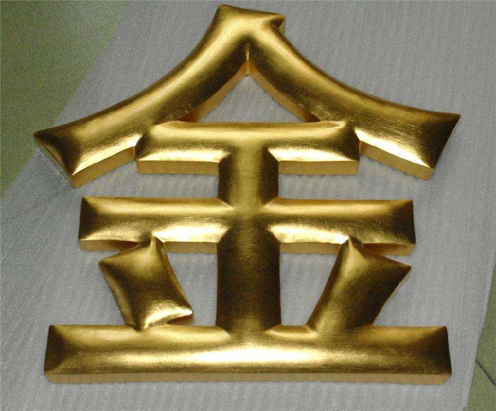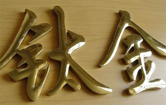 铜字。仿古铜字,铜牌,有铁字的优点外,还有个特别就是不会生锈,当然它的颜色只有一种,即金黄色字。给人感觉富丽堂皇、很威严。许多政府单位用得多,像外楼的字、门牌、行政牌等。铜,亦是较易氧化的金属,因此人们常将它进行电镀或完成字形加工后将表面抛光处理,再做封闭漆(防锈),使其金光闪闪。