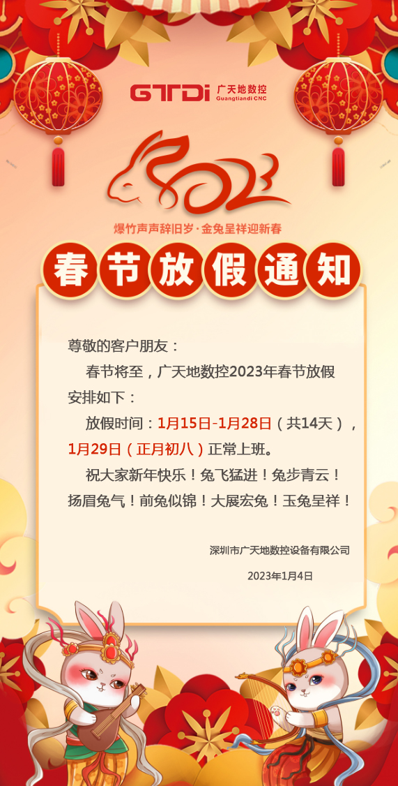 2023年春节将至,首先感谢您在2022年里的鼎力支持和愉快合作,bg真人电子数控全体同仁在此给您拜个早年。在新年的一年里,bg真人电子将更加努力,为您提供更优质的服务。按照国家春节放假规定结合我司的具体情况,春节放假时间安排如下: